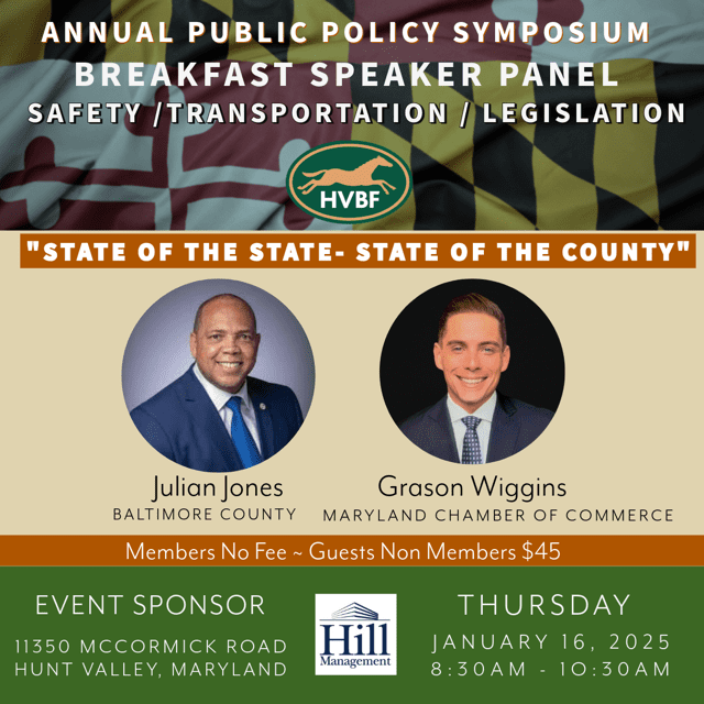 Additionally, the HVBF PPC is also holding The Annual Public Policy Symposium “State of the State, State of the County” Thursday, January 16, 2025 at 8:30 am, Executive Plaza, 11350 McCormick Road, Hunt Valley, Maryland – Grason Wiggins VP Government Affairs of Maryland Chamber of Commerce will be available to answer more questions from our members and guests on this new regulation.